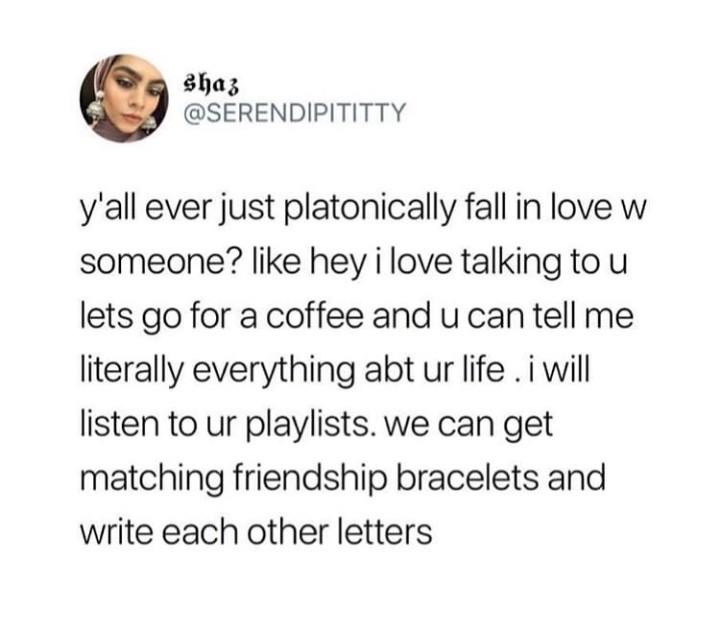 Which brings me to my point. I think that our platonic friendships tend to last and thrive with growing love, because we are usually not asking, what else???? We don’t feel unsatisfied with the people in these relationships. We are quicker to apologize, and more cognizant of the way we make them feel. At least I am. When I tell my friends I love them, I am not sitting back wondering if they love me too. I know they do. I can tell them my hopes and dreams, because the security of my household and theirs does not depend on the job I choose to take, or the amount of writing I am not doing. Platonic relationships feel more honest. More real. I am not trying to impress my friends. They didn’t meet my representative. They don’t have to deal with the bewilderment of finding out that I can be a little distant sometimes, and my matter-of-fact speech might present itself like apathy. Nor am I faced with the reality of finding out that I am bound to a stranger. We can just be ourselves with each other, which to me, is a common missing piece of relationships where people take on other names, and unwanted responsibilities.